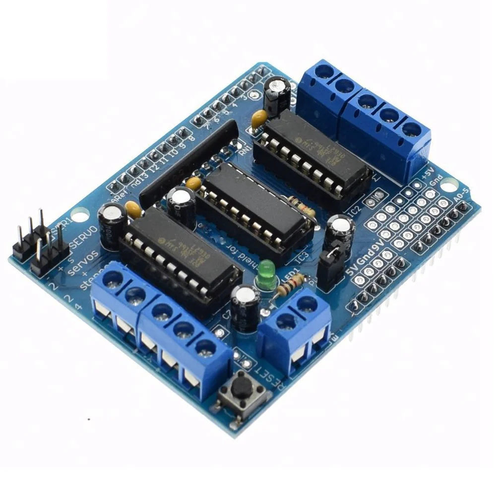 - 4 H-Bridges: L293D chip-set provides 0.6A per bridge (1.2A peak) with thermal shutdown protection, internal kickback protection diodes.